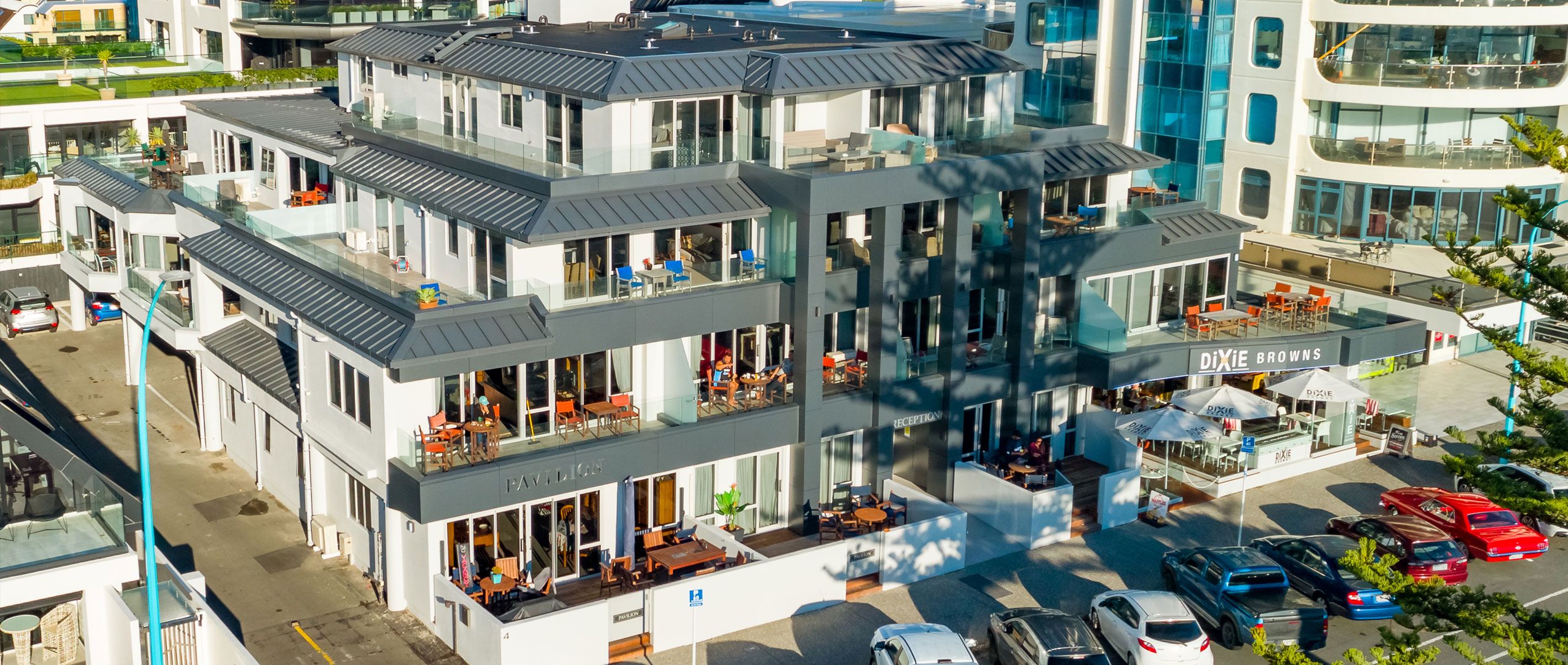 The Pavilion Apartments offer boutique beachfront apartments. Fully self contained 1, 2 and 3 bedroom apartments complete with, queen or king beds, ensuites, some with foldout sofa beds, aircon/heatpumps, full kitchen, dishwasher, fridge/freezer, microwave, oven, hob, 42" TV, Sky digital TV over 60 channels, DVD, stereo, minibar, own balconies or courtyards, WiFi secure internet, full laundry, full or partial sea views, onsite restaurant - Dixie Browns